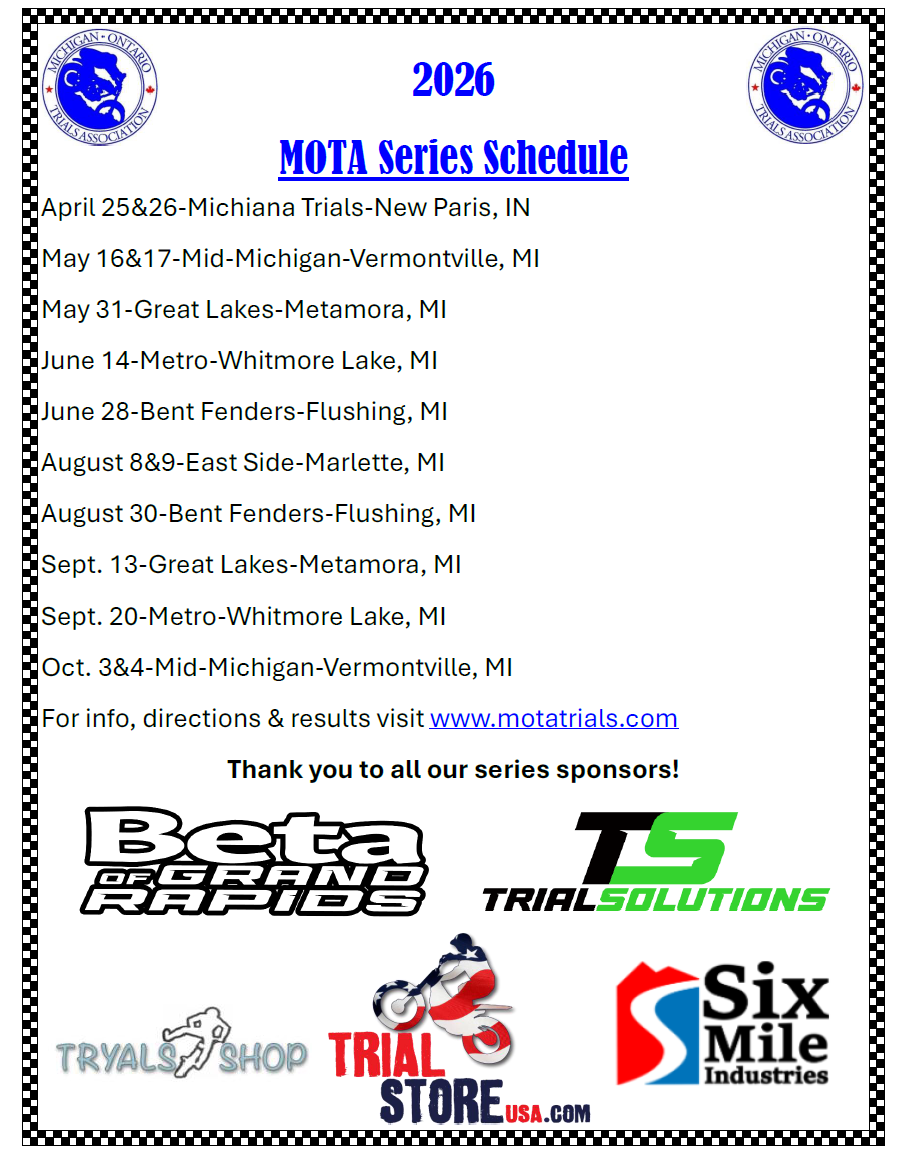 The Michigan Ontario Trials Association is proud of its rich history in promoting the sport of Observed Motorcycle Trials in the Michigan and Ontario regions. A Non-Profit organization devoted to promoting observed motorcycle trials activity in the Michigan-Ontario Area. Composed of a number of member clubs, M.O.T.A. sponsors virtually all trials events held in the area. Each observed trials is organized and conducted by one of the member clubs solely for the enjoyment of other M.O.T.A. club members, and any other riders who wish to participate. Any fees collected are intended only to provide enough funds to perpetuate the sport.